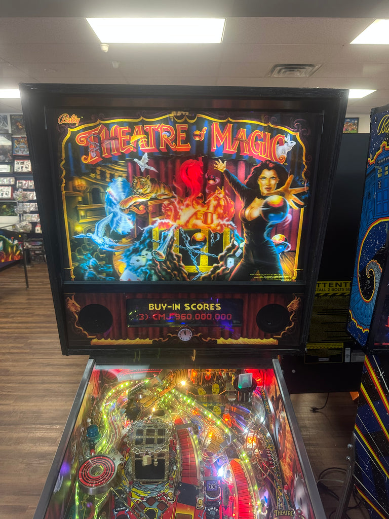 Theatre of Magic is a pinball machine from March 1995, manufactured by Bally. The goal in Theatre of Magic is to perform eight different magic tricks and then complete a rather simple wizard mode. This game has multiple side goals such as the video mode that features a virtual pinball machine and spelling "Theatre" and advancing the clock to Midnight Madness This is an extremely nice example of the game with multiple upgrades including a full color display, interior side art blades, brand new LED's and rubber parts.