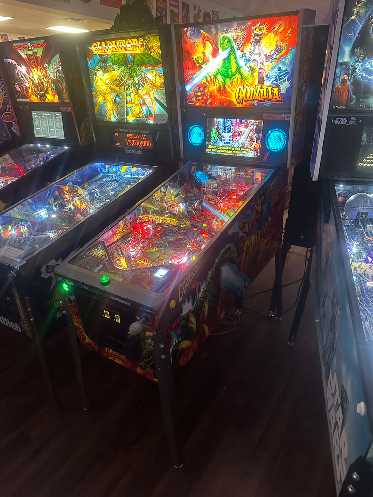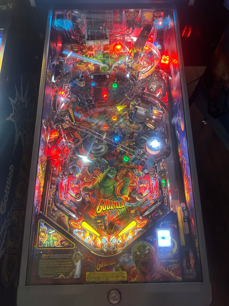 This game is loaded with upgrades including powder coated armor and legs, interior side art blades, interactive light up Godzilla figure, speaker lights, speaker acrylics, Stern Insider connect, alternate translite (comes with the original), Stern official shooter rod mod, Godzilla side armor, Godzilla shooter rod plate, and a shaker motor.