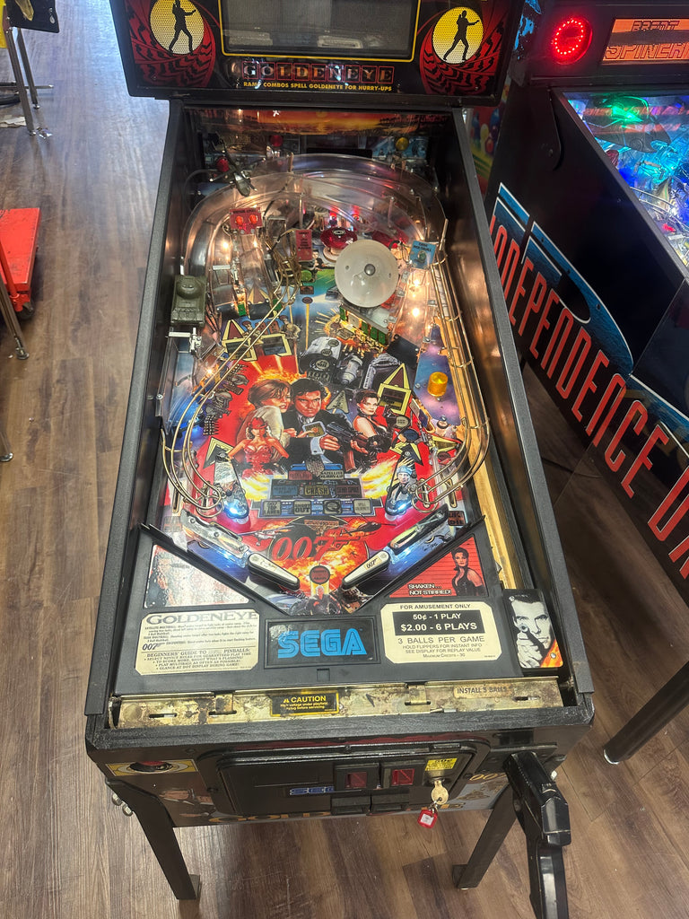 Goldeneye is a pinball machine from March 1996, manufactured by Sega Pinball, Inc. This game has a rotating satellite dish with a magnet in the middle that captures the ball to start multi-ball. There is a magnet under the playfield that propels the ball back onto the playfield when it drains down the middle. This game has been fully upgraded with brand new LED's and rubber parts. This is a beautiful example of this game.