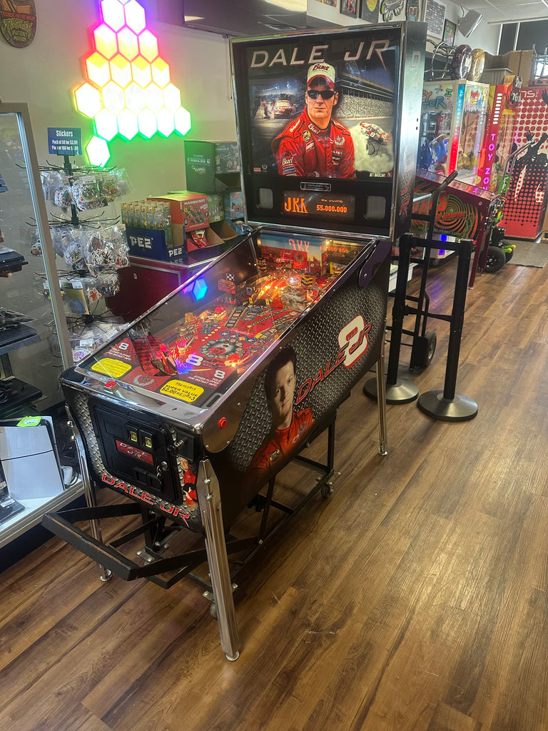 Stern Pinball's 2007 limited edition Dale Earnhardt Jr pinball machine is a true collector's item! Only 600 units ever produced! Based on the popular NASCAR pinball machine by Stern, the game includes Dale Earnhardt Jr. colors and artwork on the cabinet and playfield. It features a chrome frame and special edition backglass.