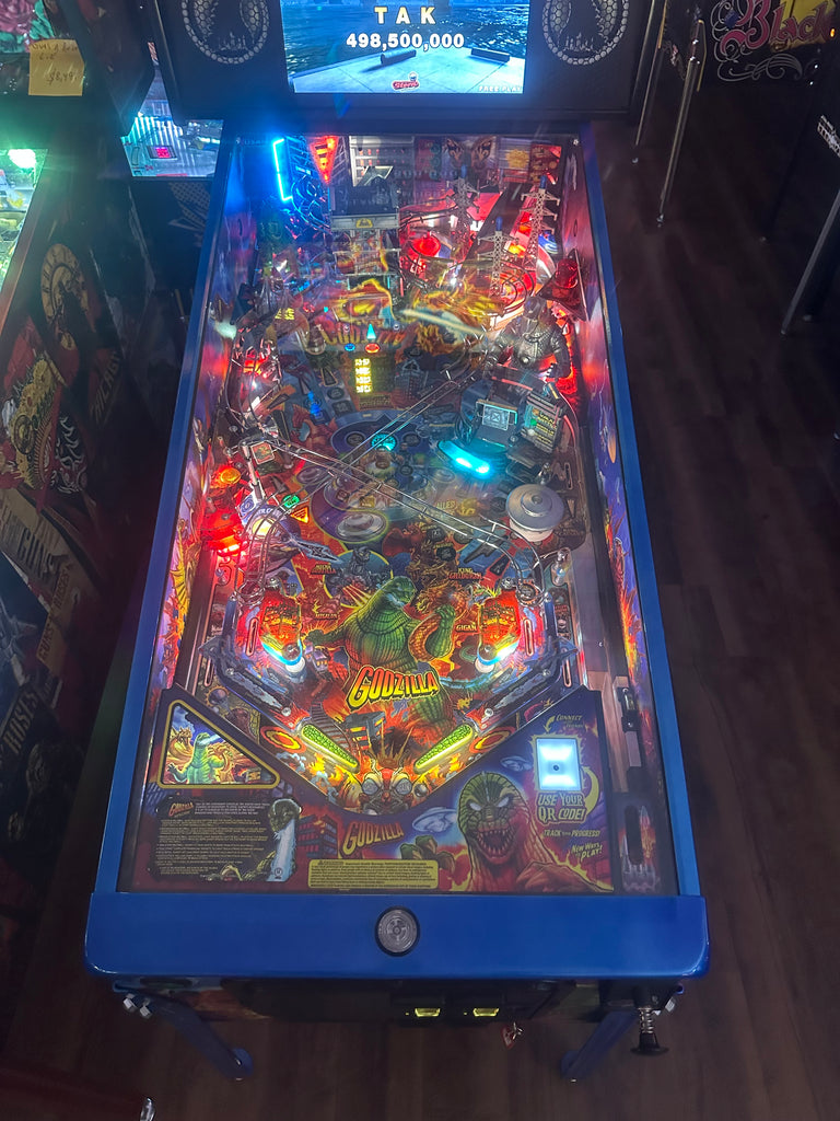 This game is loaded with upgrades including blue powder coated armor and legs, UFO pop bumper mod, interior side art blades, interactive light up Godzilla figure, speaker lights, speaker acrylics, interactive Tesla towers, Stern Insider connect, and a shaker motor.