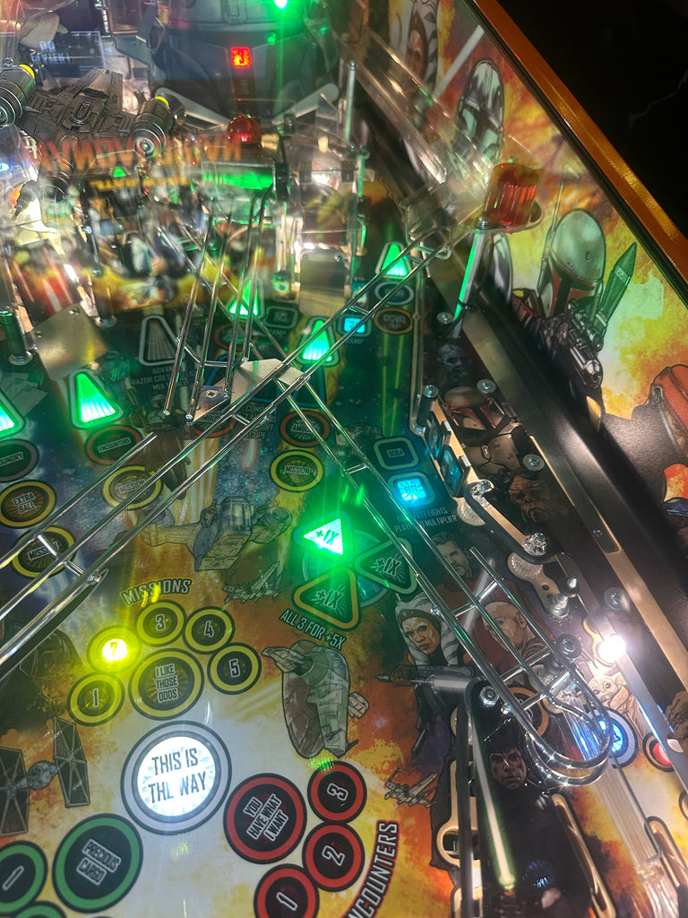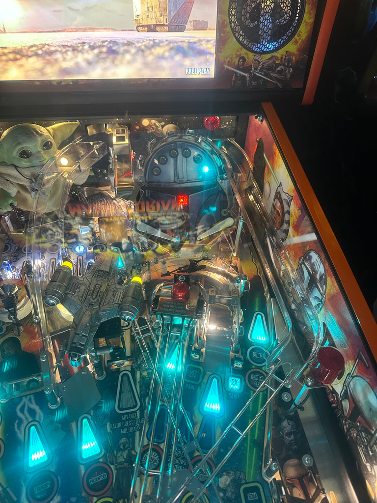 Players can navigate their way to multiball mayhem by hitting a unique hanging uplift target attached to a custom molded Razor Crest ship. Success in hitting the target qualifies a center ramp shot on the Pro, Premium, and Limited Edition models.