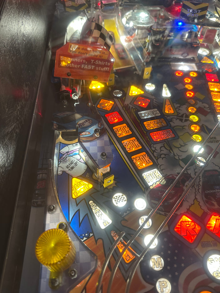 A primary component of NASCAR Pinball is the racetrack that encompasses the entire playing surface. Energized by magnets, the loop sends pinballs racing around like cars racing around a track. NASCAR Pinball also features a truck hauler that the player can launch a ball through along with a test toy car that the player can bang with the pinball.